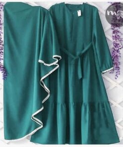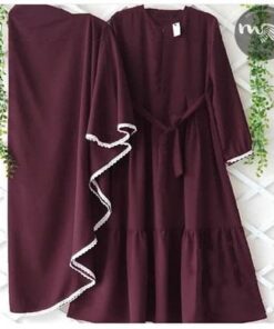 Ensemble enfant Zuhour de la marque Mouhajiroun, composé d’une jolie abaya plissé avec un turban a la taille et d’un hijab avec de petites dentelles sur le bas